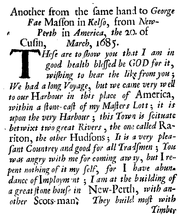 In these letters to his uncle James Brown, shoemaker, and George Fae [or Fall], a mason and freemason, both in Kelso, he extolled how pleasant a country he had found East Jersey to be, and how much work there was to be had by masons. He hoped his sister Katharin would join him and perhaps another relation called Francie.